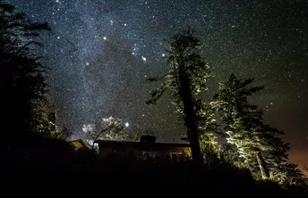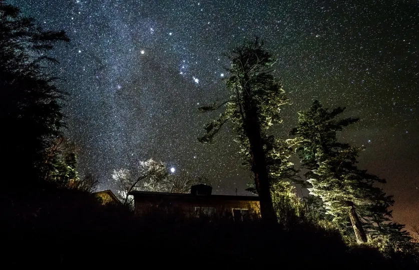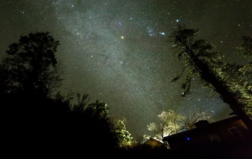 雅安石棉县王岗坪景区牧云庄拍摄,星空下的林间木屋