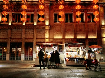三坊七巷的面人和花灯摊位被红灯笼点亮