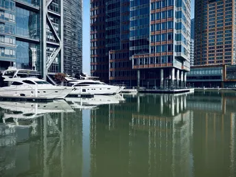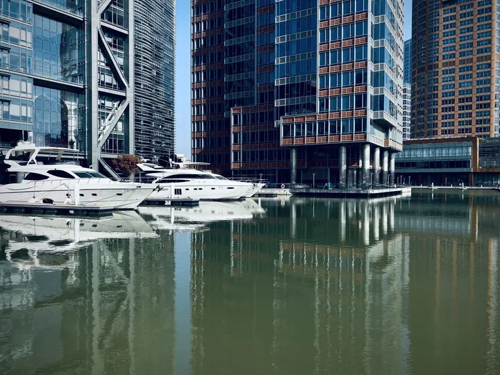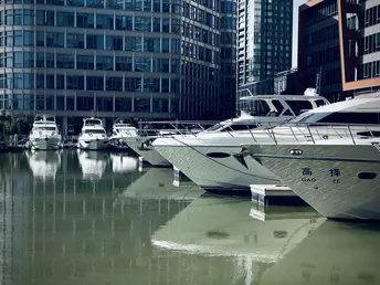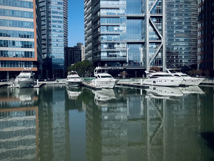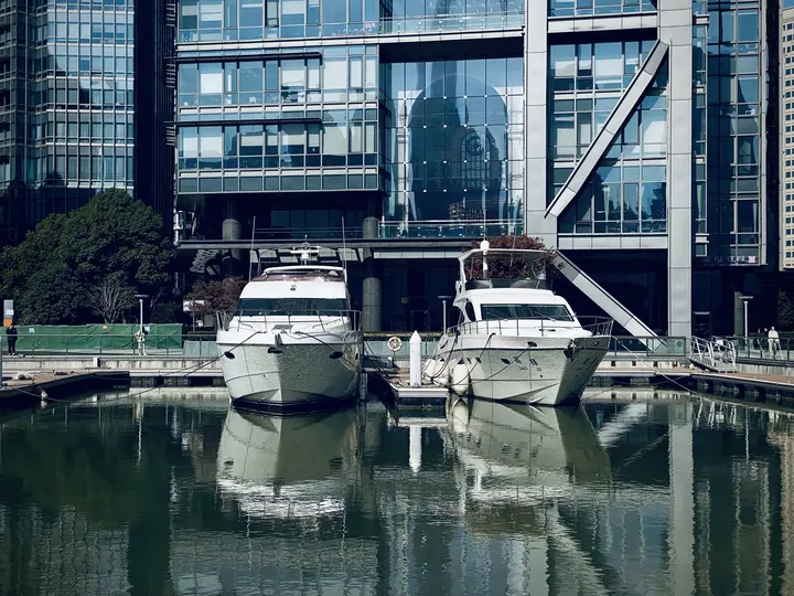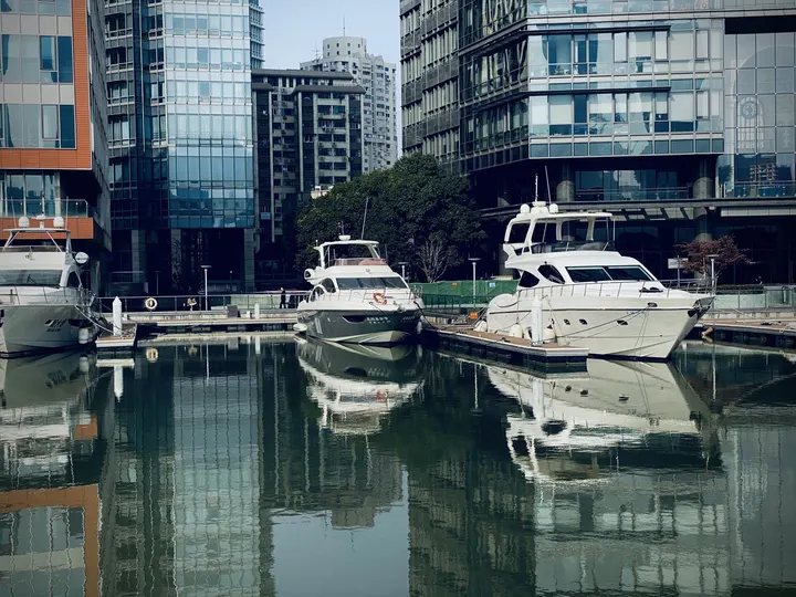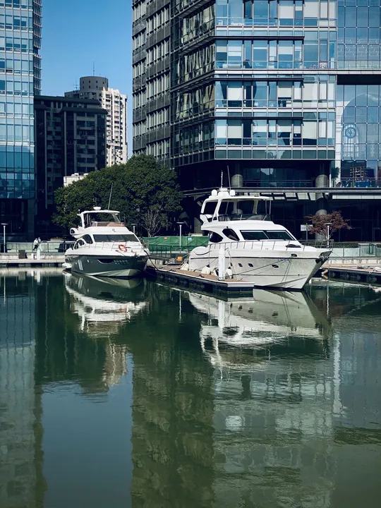 午后的阳光还是比较强烈的,办公楼和游艇倒影在清静的水面上