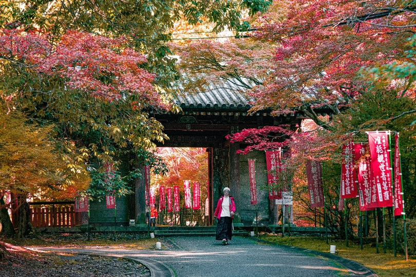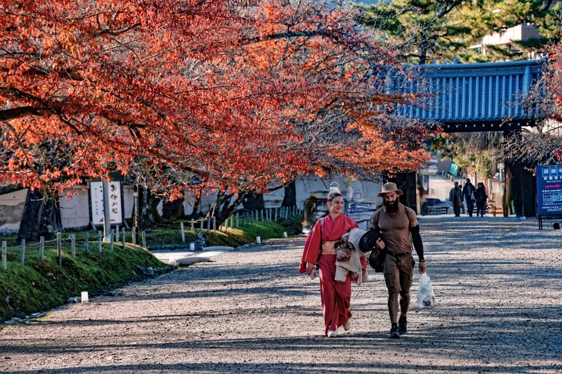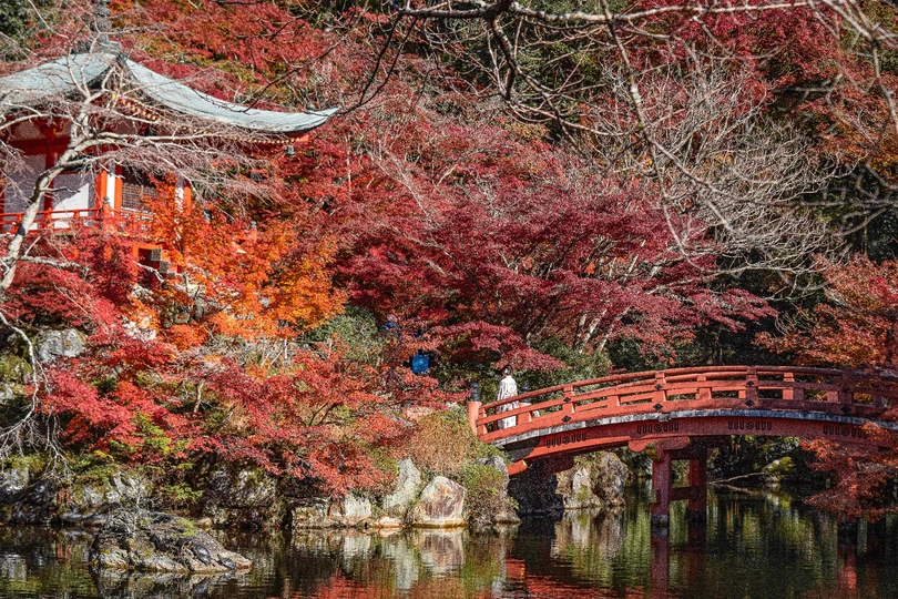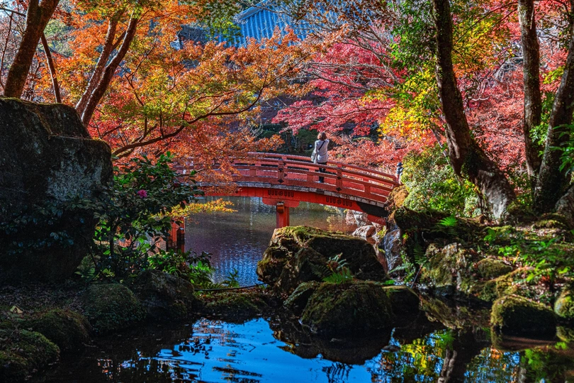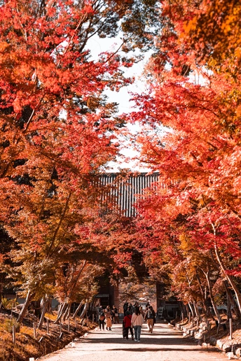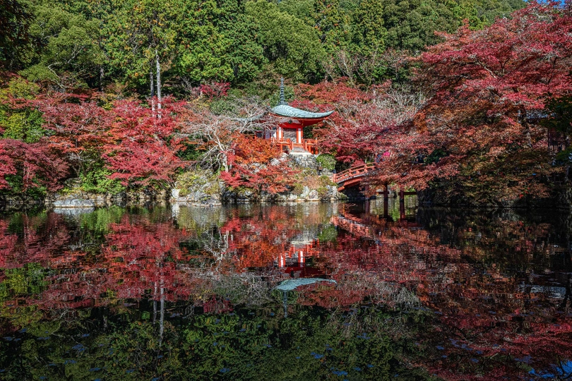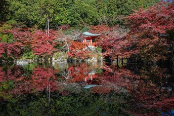 每年秋天,京都的醍醐寺都会被红叶装点成一幅美丽的画卷。寺庙内的建筑和庭园与红叶相互映衬,营造出一种宁静而神秘的氛围。 如果你来到醍醐寺,一定不要错过主殿周围的红叶,这里的红叶树高大挺拔,颜色鲜艳,非常适合拍照留念。此外,醍醐寺内还有许多其他的景点,如三宝院、伽蓝等,都值得一看