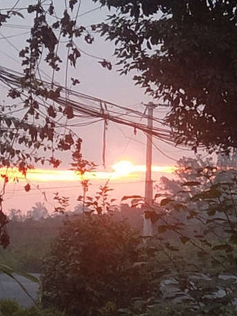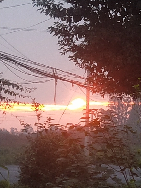 6点起床打扫完卫生,出门看见太阳成了一条直线,光芒四射,金光闪闪发光万丈。