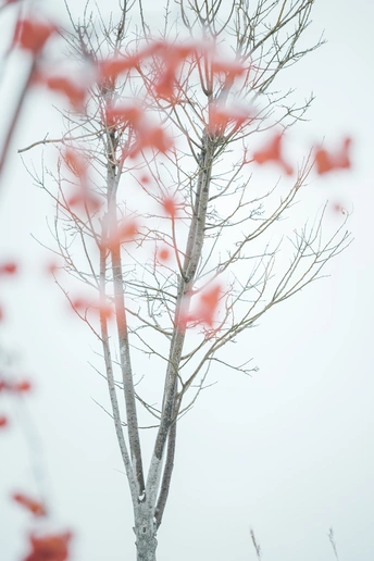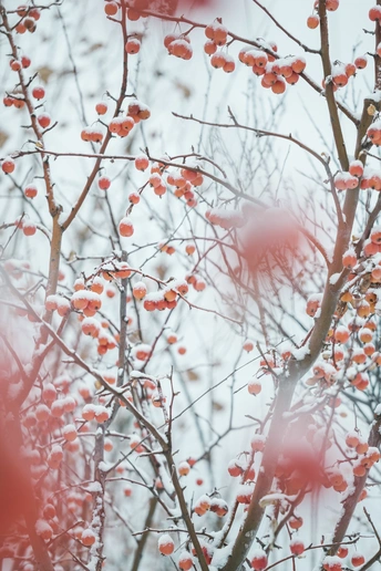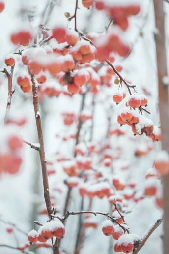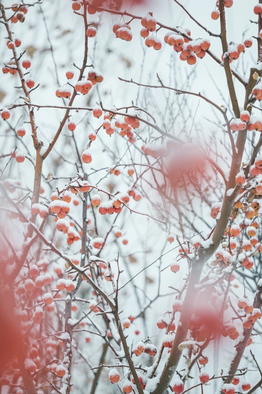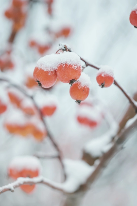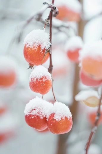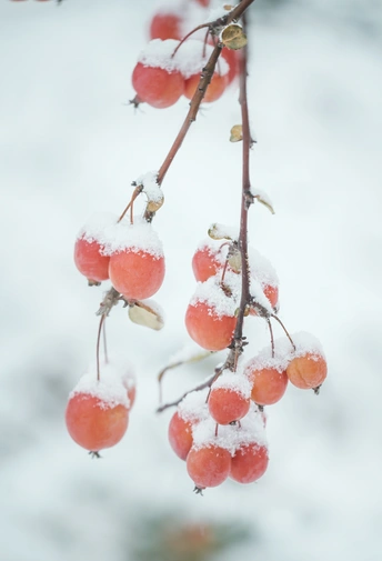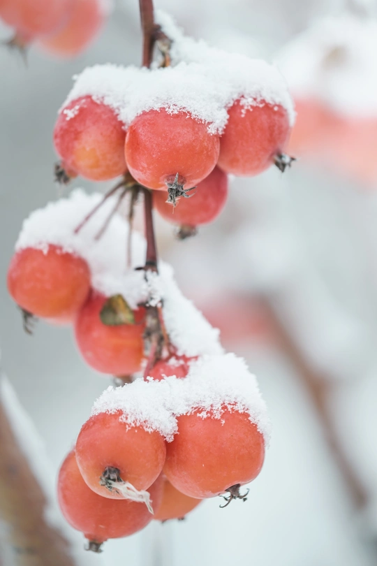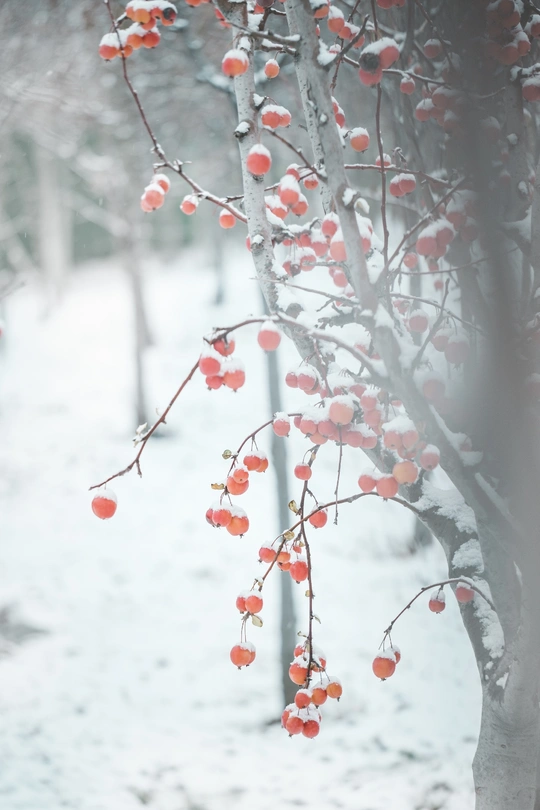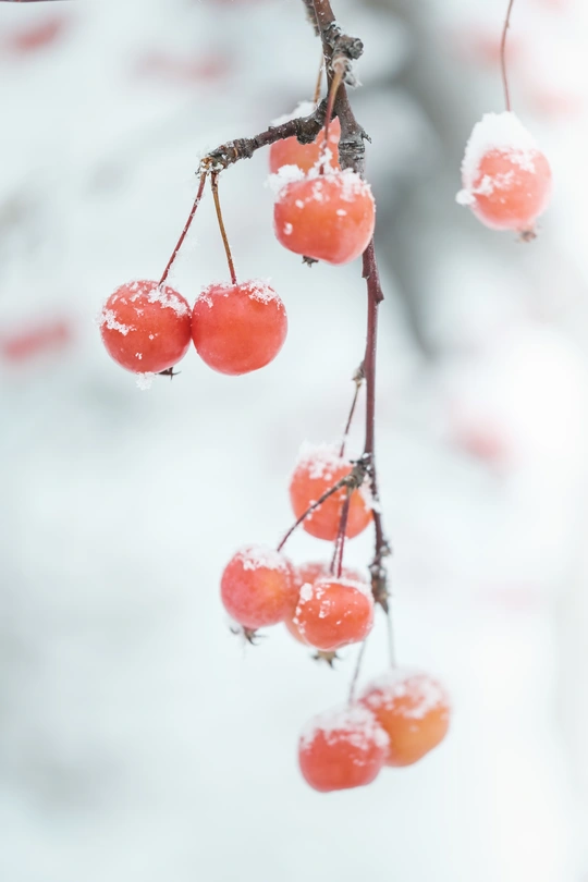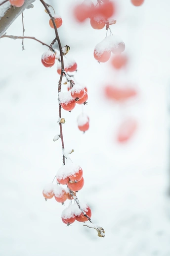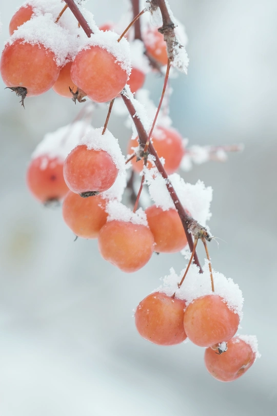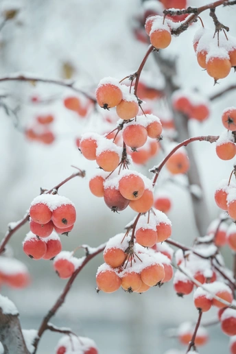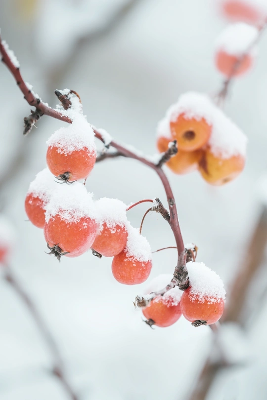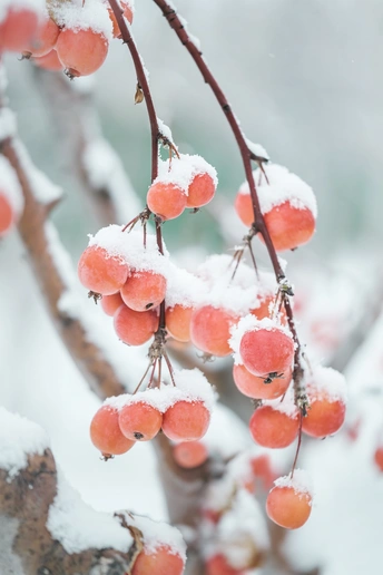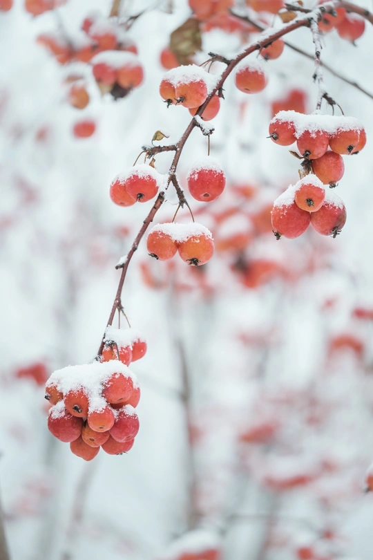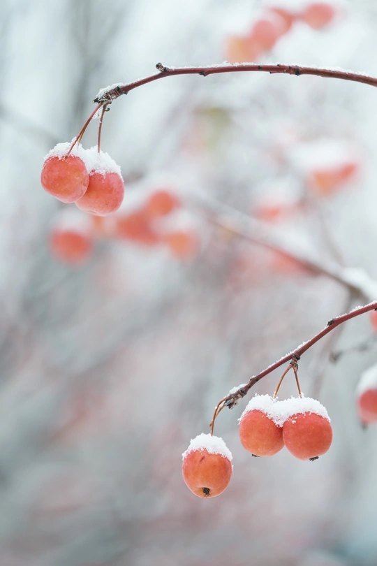 海棠果,果实丰满、色泽鲜艳,寓意着平安、幸福,被雪花覆盖着小巧的海棠果,玲珑剔透,如诗一般的光景,任岁月流逝,那一抹海棠红就这样在枝头守望着凌霜傲雪,静默无言,守望来年春季与花苞的相逢。