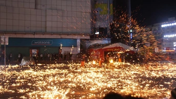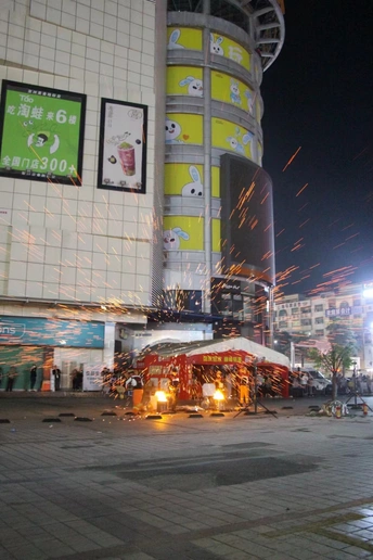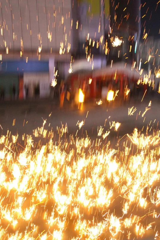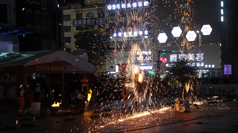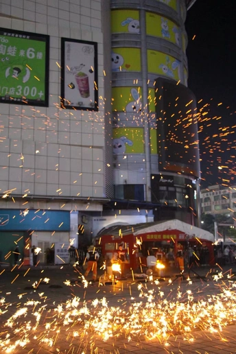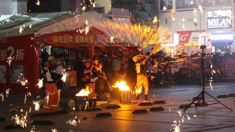 打铁花是一种大型民间传统焰火,是中国古代匠师们在铸造器皿过程中发现的一种民俗文化表演技艺,始于北宋,盛于明清,至今已有千余年历史。打铁花多流传于黄河中下游,以河南、山西最为流行。开封打铁花更被誉为黄河流域十大民间艺术之首。打铁花表演时,在一处空旷场地搭出六米高的双层花棚,棚上密布新鲜柳枝,上面绑满烟花鞭炮和起货等。棚中间竖立一根六米高的老杆,使花棚总高度达到十米以上。旁边设一熔炉化铁汁,十余名表演者轮番用花棒将千余度高温的铁汁击打到棚上,形成十几米高的铁花,铁花又点燃烟花鞭炮,再配上“龙穿花”的表演,场景蔚为壮观,呈现出惊险刺激、喜庆热闹的特点 2008年6月,河南省确山县申报的打铁花经国务院批准列入第二批国家级非物质文化遗产名录,遗产编号Ⅹ-88