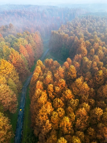 一个旅人走入清晨晨雾包围中的大片水杉林