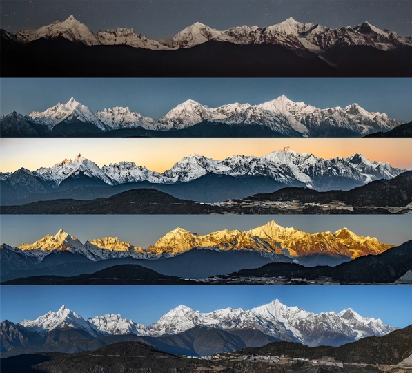 从夜晚到白昼,从月照银山到日照金山,不同时段的梅里雪山组成了这一幅“梅里十二时辰”。