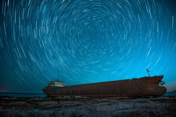 这艘船是由于前几年的台风而搁浅的,因为并没有及时的把他拖走,所以沉船和当地的地形组成了很美的景观,但是很遗憾,这搜搁浅的大船已于2022年11月24日凌晨拖走,小黑石沉船已经成为历史。很巧北极星就在沉船上方,很容易就能拍出完整星轨