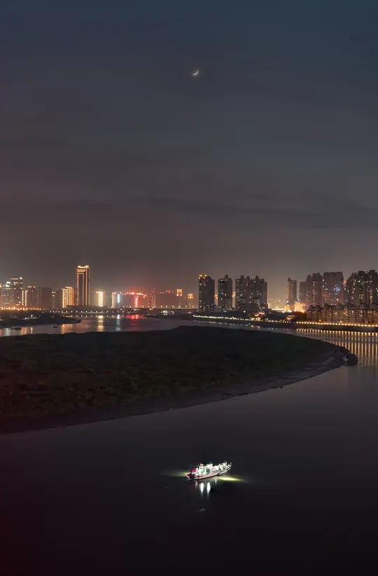 月亮高悬,晋江大桥下,小船停泊江中,夜色静谧,如诗如画。