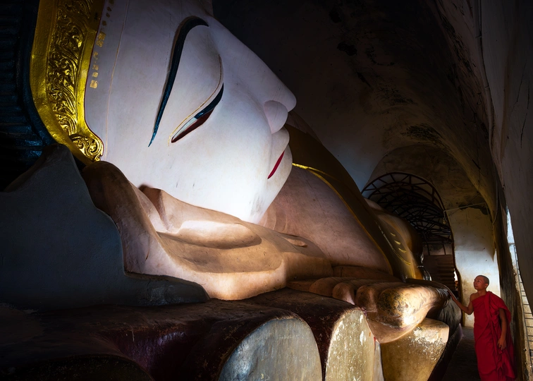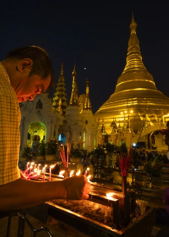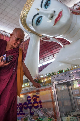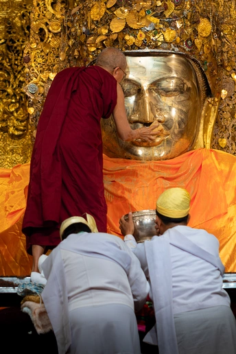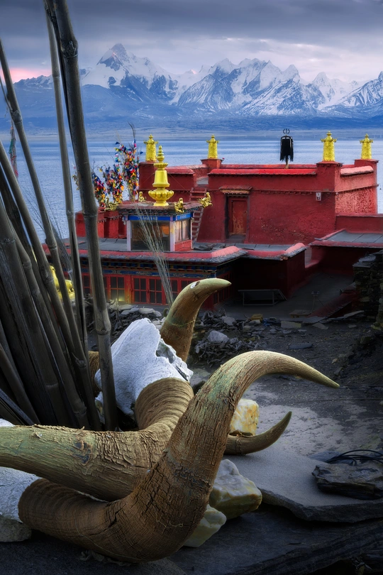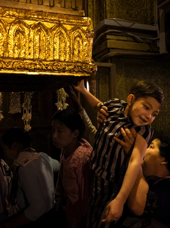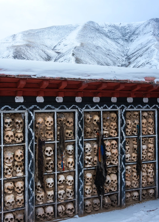 现今的世界,是一个信仰科学理性、已对宗教观念祛魅的时代。原本对前现代的古人来说需要郑重对待的节日、观念和仪式,早已被这个短平快的消费主义社会所裹挟和解构,赋予了它们和原先相比要轻浮地多的意义。但是,在当今世界的某一些角落,依旧有一些人把自己沉溺于他们祖先世世代代所信仰和流传的精神世界之中,将其作为生活中最最重要的组成部分。这一组作品,就捕捉了那样一些生活于浓重的宗教传统中的人们醉心于祈祷和沉思的瞬间,还有在他们的肉体消逝后他们的信仰为他们所留下的痕迹,以及他们的信仰驱动他们在世界上所建造的一些美妙事物,涉及东南亚的佛教印度教、欧洲的基督教,以及中国西藏的藏传佛教。在这些被摄者的脸庞上眼神里肢体中,我看不见所谓的愚昧或是迂腐,而是有着一些清澈和坚定。也许怀抱着一些宏大的信念,允许自己被超越理性的力量支撑,会让人更容易相信此生存在的意义。 图三:缅甸波达通佛塔,传说佛塔的金柱里藏有佛陀的发丝,当地人以抚摸它来求得吉祥。一个孩子被家人高高抱起,让他顺利地触碰到了金柱,使他露出开心的笑容 图十二、西藏比如县达木寺。以前当地人死后,就在寺院后山上的天葬台举行天葬,天葬留下的头骨就被砌进这堵墙中