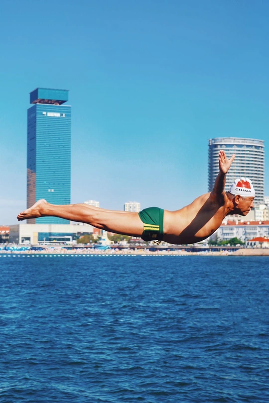 在青岛栈桥景区 大爷大妈们井然有序的争先恐后的“飞”入水中 湛蓝的天空 咸咸的海水 1 2 3 一鼓作气小跑到岸边 像鸟儿一样 旋转 “嚯”的一身 好像是最完美的姿态 “噗咚”一声 矫健的大爷钻入水中 景区的游客和队友纷纷鼓掌欢呼