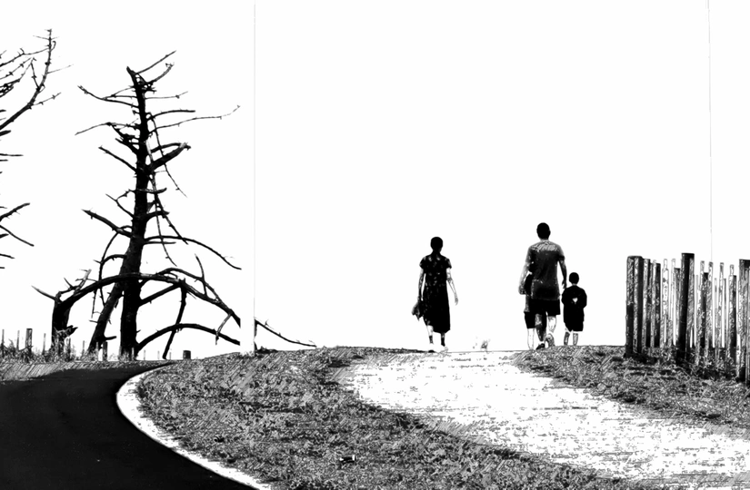 在这条上坡弯道路上,左边的寿字树形象自然,右边的散步游人享受这大自然的美妙空间。黑白剪影的表现形式,突出了人物和树影的视觉效果。拍摄于新西兰奥克兰长湾地区国家公园。