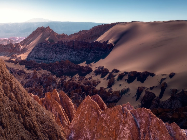 智利北部的阿塔卡玛沙漠(Atacama)是世界上最干旱的地方。那是一片超现实之地,布满了荒凉的沙丘、尖锐的风化岩石,以及威严的火山。酷烈的风始终吹拂,白天的烈日将一切晒干,而夜晚又似苦寒冰窖。图为月亮谷Valle de la Luna的一景。