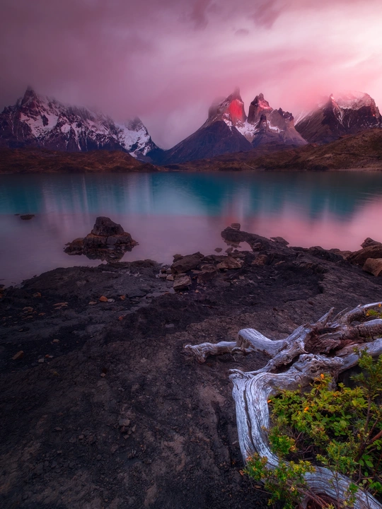 拍摄于智利巴塔哥尼亚的百内国家公园(Torres del Paine),在日出前的朝霞中,隔着湛蓝的裴欧湖(Lake Pehoe),遥望百内群峰。