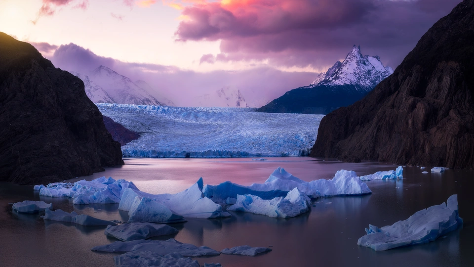格雷冰川 Glacier Grey 位于智利的百内国家公园的西侧,是世界著名的 W 徒步线必经的一站。冰川宏伟壮丽,是幽蓝的极寒荒原,冰原上布满了崎岖的冰褶皱和冰裂缝。 冰崖之下是格雷湖,冰崖远观似乎并不起眼,但其实有30多米高,如果坐邮轮近距离观赏,会感叹好一堵不可逾越的冰雪城墙。 冰崖上融化剥落的冰块掉落到格雷湖里,形成一座座巨大的冰山,整体荒凉宏大的景色令人感到仿佛来到了世界的尽头。