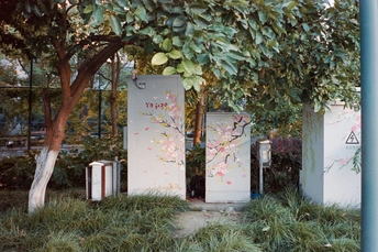 原本普通的路边配电箱上被绘制了一副飘扬着樱花的画,仿佛此刻起风了