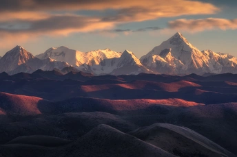 日落的金色夕阳中,贡嘎北坡披冰带雪,如同一座岩石的金字塔。