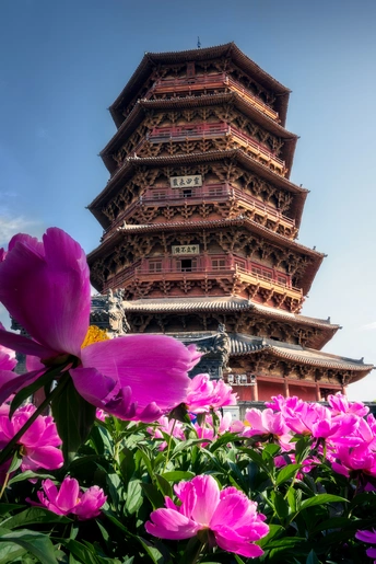 应县木塔,坐落于山西大同附近的应县,据考证建于公元 1056 年左右,迄今已逾近千年。全塔完全由木头建成,几乎是一个榫卯和斗拱的博物馆。以5月份盛开的芍药花作为前景。