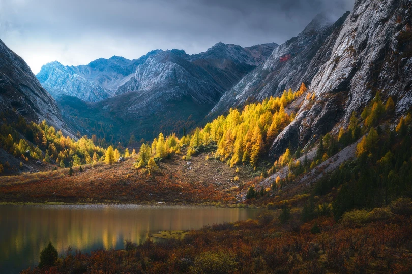 川西秘境【七藏沟】, 野性桀骜的石山好像城堡,包围着一片黄金似的秋色, 青黑的山壁上,石缝支离破碎、沟壑纵横, 却反而成了这片彩林扎根其中、汲取养分的输血管。