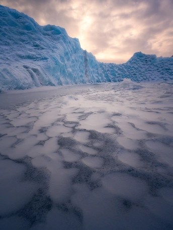来古冰川,冻结的冰湖被大风吹出了一道道纹路,加上覆盖了雪,看起来就像蛇的皮肤一样。而远处日出的朝霞照耀下的冰山是那么的蔚蓝。