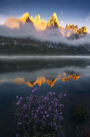 拍摄于年保玉则自然保护区的妖女湖畔。前景紫色的花丛为画面添加了一些神秘的氛围,而年保玉则标志性的尖锐的尖塔状群峰正上演日照金山,它腰系着腰带云,倒影在湖中。