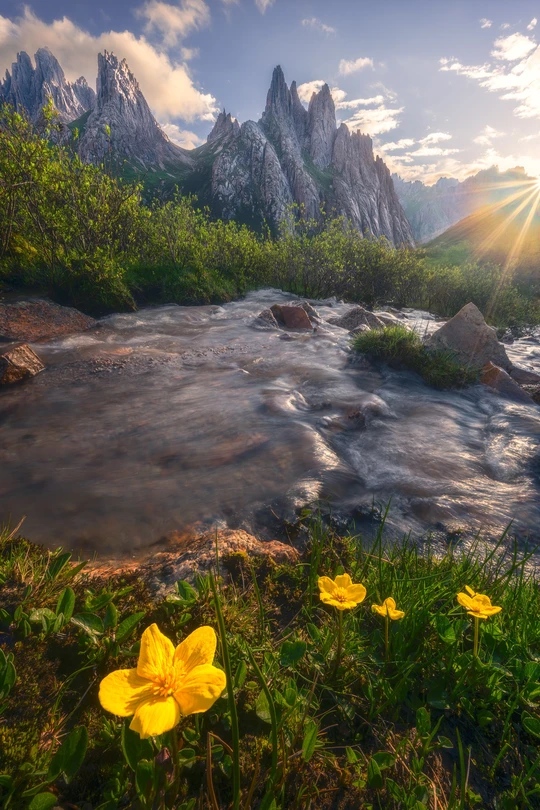 山峰、溪流和花朵