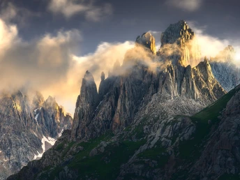 被日落的金色光线照亮的流云,如同丝绸一般,流动在年保玉则嶙峋峥嵘的尖塔状石峰之间,形成动与静、柔与硬的对比。