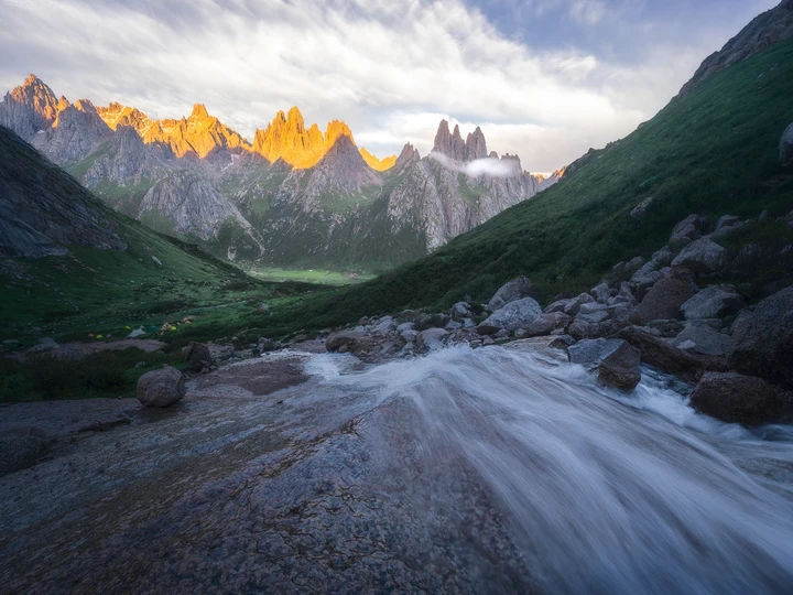 在短暂的夏季里,原本荒芜冷峻的年保玉则终于恢复了一些生机。依靠夏日丰沛的降水和冰川融水,年保玉则山区内充满了各种河流和溪流。这些河流在山石的高低落差间形成了许多的瀑布,如同图中的那样,向着远处被日出的光线照亮的连绵的尖塔状石峰疾驰而去。