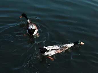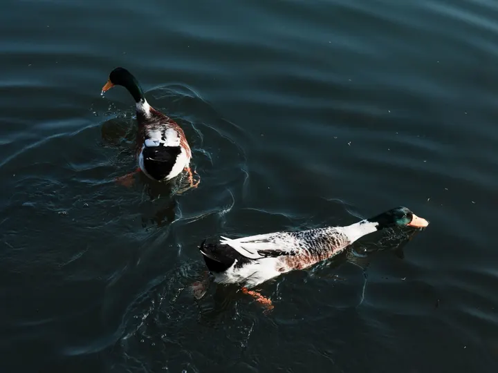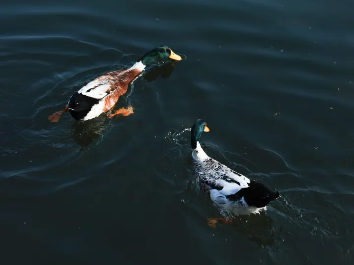 冬日暖阳下的西湖,两只水鸭子自由自在地在水里嬉戏。
