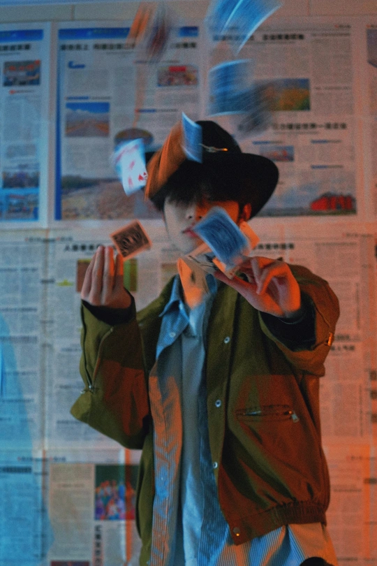 他说给我玩个魔术,把扑克牌抛在空中,然后可以夹住大小王;我说也给你玩个魔术,我用报纸墙、蓝色和橘色光布景,用70-200对焦你的大小王!看到片子后,他说摄影师也是魔术师!