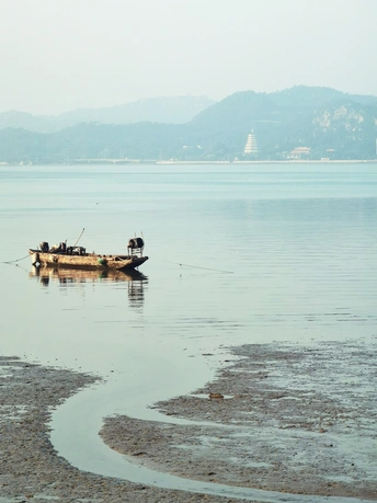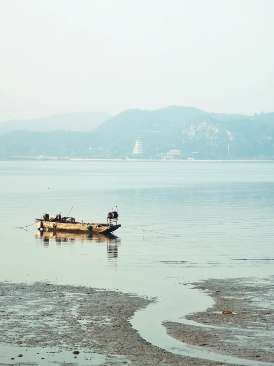 汕头内海湾南滨被雾披上轻纱,阳光照射在泊在内海湾的一艘小船,形成水中倒影,呈现一片静谧的氛围。