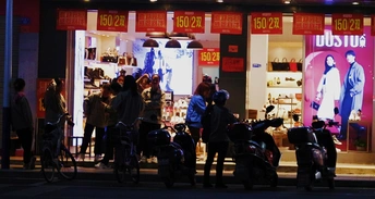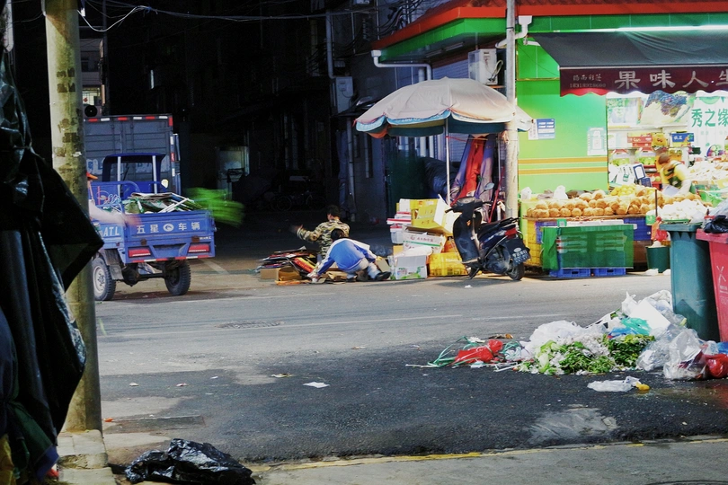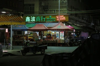 (相机)摄影作品:《一边生意,一边工作》 调色 调色处理 剪图 剪图处理(第一张照片) (有家店生意爆火,好多人买衣服,也有人在店里面发呆着,(还有人,等不到生意,看一下手机,一个老奶奶,做一个动作<第三图片>),也有自己父亲,跟她的女儿,捡一下垃圾,卖一下垃圾,生活多么自在,自在夜晚)