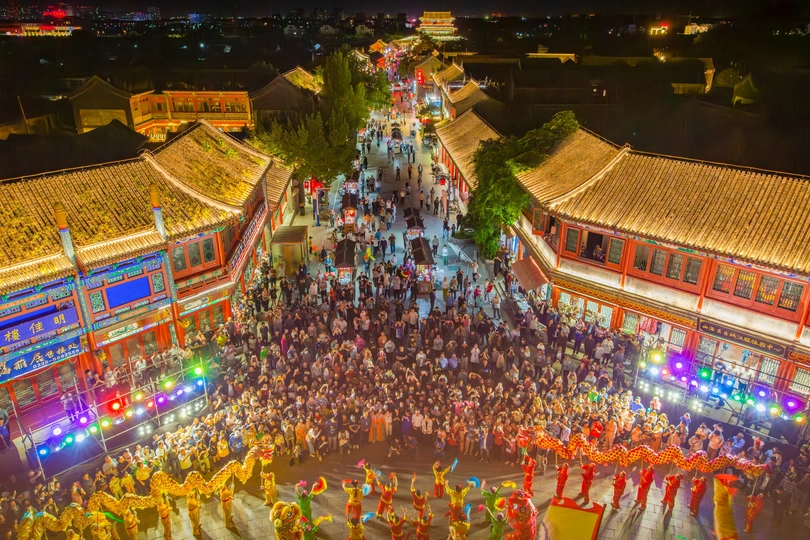 2023年9月22日,拍摄于河北省秦皇岛市山海关古城,表现了夜晚热闹的场面。