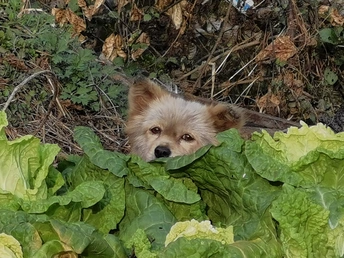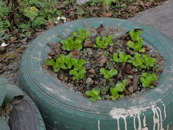 一户农家干净的院落里,几只彩色的轮胎里种着绿色的菜,拴着绳的留守小狗先是吠叫,又是退缩疑虑,最后是懒得理你。 感觉小狗的眼神里有悲伤,小狗小狗,你是否太孤独无聊了呢?