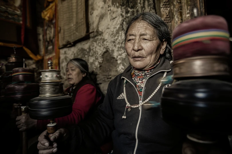 2019年5月18日,拍摄于四川省甘孜州丹巴县莫斯卡,表现了老人转经祈福的场景。