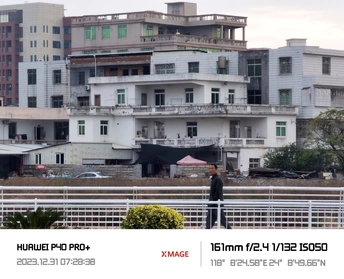 一人穿行于道路,建筑群在后,前方目光坚定,直视镜头。