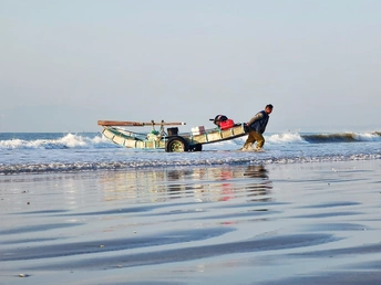 靠山吃山,靠水吃水。生活在南山湾附近的人们,出海打鱼即讨海,是重要的生活出路之一。竹排渔船是一种比较简单的方式,使用莲网在近海处进行人工捕捞。出渔归来时,竹排渔船要拉上海边沙滩停放。