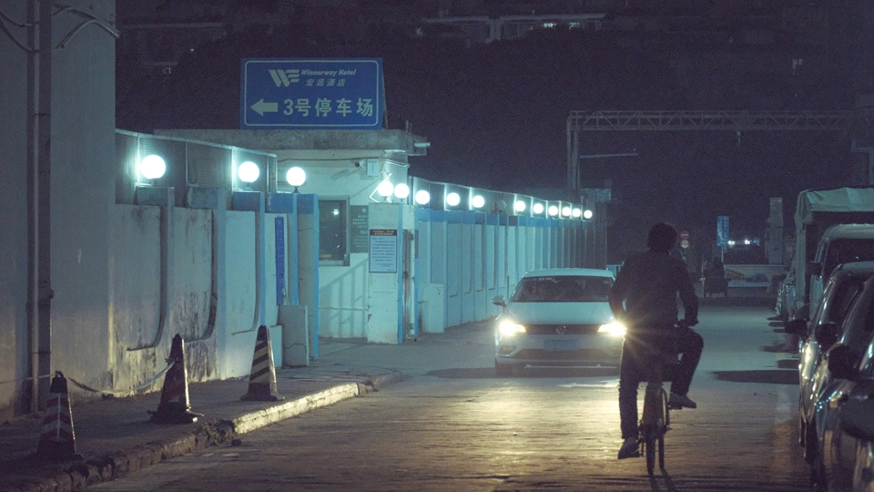 在夜晚的一个小巷里,正好看到汽车与自行车会车,左边建筑的灯光形成冷色,汽车的车灯为暖色,形成了很好的冷暖对比,便在此抓拍到了这瞬间!