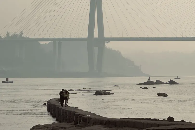 拍摄于重庆市永川区松溉古镇江边,一对情侣正在桥上聊天,从远处就听到了他们愉快的笑声,于是我拿起手机,记录下这美好的一瞬间。