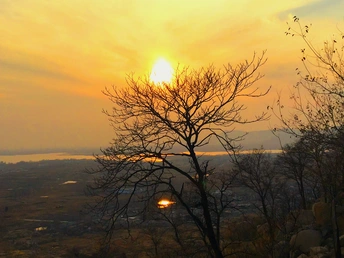 日落时分,前方的一棵树恰巧位于太阳的下方,好像托举着缓缓下降的太阳。