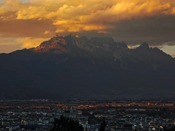 这两张照片拍摄于中国云南的丽江市。这两张照片是我在一座明代古楼上拍摄的,在照片里面远处是中国少数民族纳西族的神山玉龙雪山,当地人称为”欧鲁“,雪山脚下是纳西族人的古城名叫丽江古城。丽江古城四面环山,夕阳时恰好有一束阳光从山坳里撒进来,照射到整座城市上。我在这座明代建筑上拍摄时,按下快门的那一刻,过去,现在,将来,仿佛在那个小小的时空碰撞到了一起。