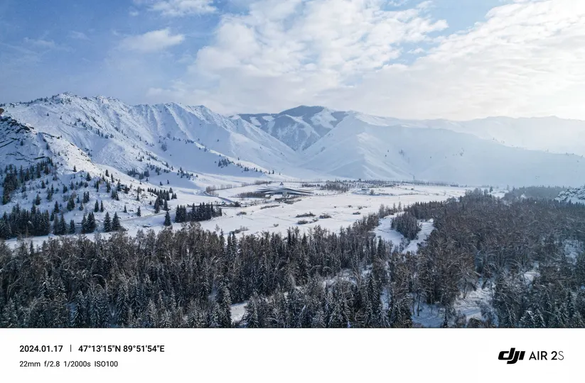 冬季一月中旬,新疆可可托海航拍。 白雪皑皑的山和底下的森林形成对比