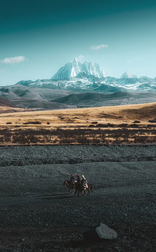 冬季的川西高原,雪山下,几位牧民沿干涸的河床乘马而行。
