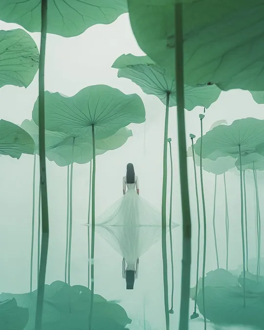 在这幅用ai创作的超现实主义作品中,使用了白色和浅绿色的柔和调子,描绘了一位穿着白色长裙的女子,她静静地立于荷塘平静的水面之上,背对着镜头,仿佛在诉说着一个无声的故事。画面前景的高大荷叶和修长枝干,与远处女子的轮廓相互辉映,构成了一幕宁静而纯净的自然景致。这幅画不仅仅是对美的颂歌,更是对内心平静的追求与表现。
