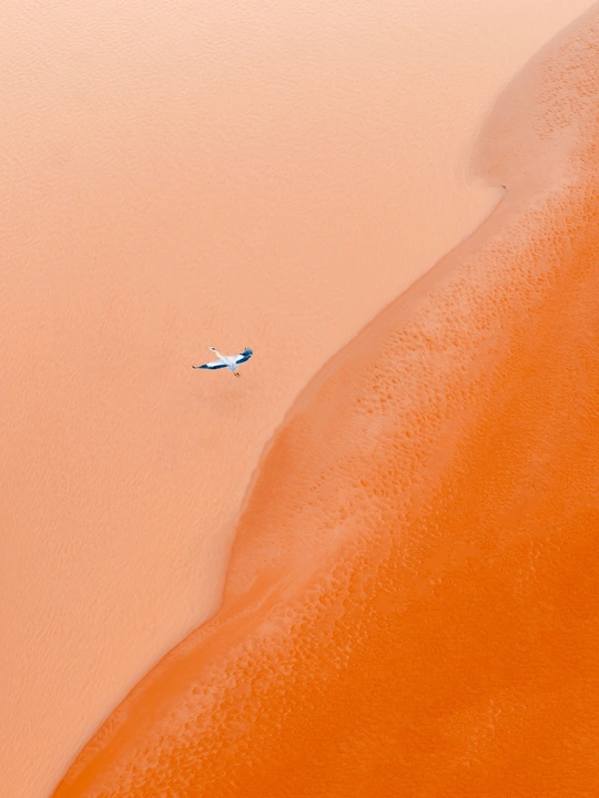 冬季黄河沿岸,众多候鸟栖息于此,沿岸经过流水的冲刷呈现出柔美的线条,一只鹭鸟飞过,我用航拍捕捉到这一画面