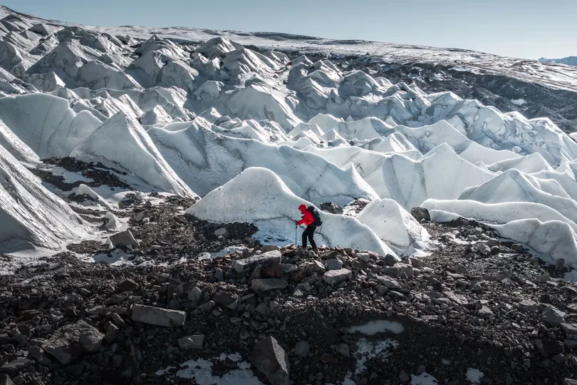 艳阳之下,一位旅行者艰难的攀爬着冰川,而他背后是层峦叠嶂的大陆冰塔林。