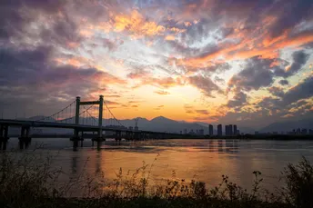 夕阳缓缓落下,天空被染成一片温暖的橙色。在这片天空的映衬下,一座桥横跨在宁静的江面之上,显得格外醒目。江面反射着夕阳的光芒,仿佛整个世界都被温暖的橙色所包围。