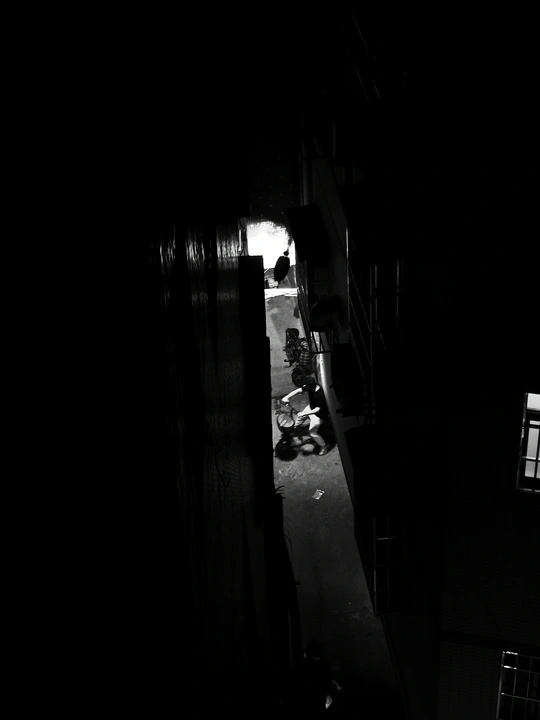 广州的城中村都是握手楼意思是楼宇之间距离很近,两个楼之间可以直接握手。图中是一个夜出的人在窄巷里掉头自己的电动车
