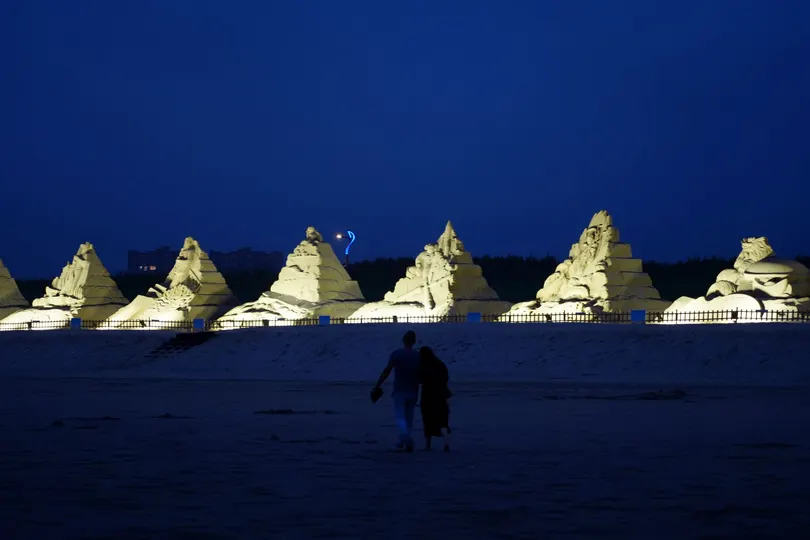 在温暖的阳光下,一对情侣漫步在沙滩上,他们的身影在洁白的沙地上留下长长的影子。背景中,巨大的沙雕作品映衬出浪漫的气息,仿佛整个世界都为他们静止。他们手牵手,欣赏着海浪轻拍岸边的声音,感受着彼此的心跳。沙雕在他们背后显得格外壮观,像是见证他们甜蜜爱情的守护神。