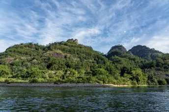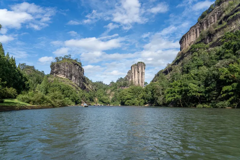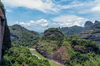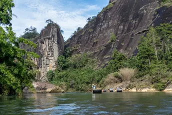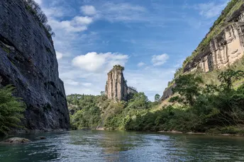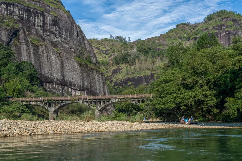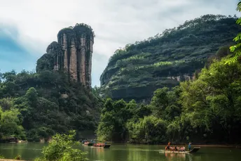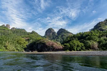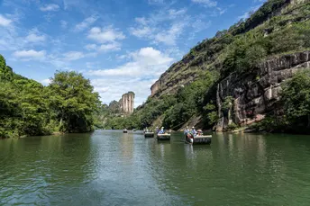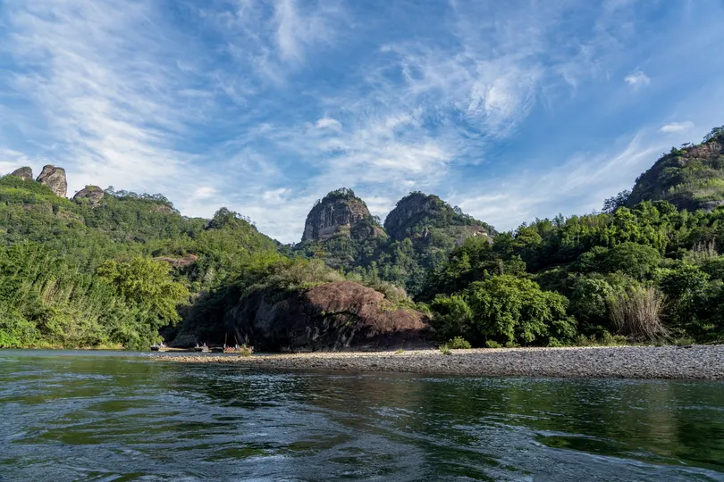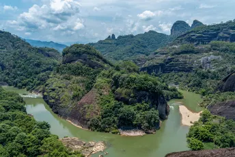九曲溪是武夷山脉主峰——黄岗山西南麓的溪流,位于福建省武夷山峰岩幽谷之中。因武夷山有三十六峰,九十九岩,峰岩交错,溪流纵横,九曲溪贯穿其中,蜿蜒十五华里。又因它有三弯九曲之胜,故名为九曲溪。它全长约10公里,面积8.5平方公里。山挟水转,水绕山行,每一曲都有不同景致的山水画意。“溪流九曲泻云液,山光倒浸清涟漪。”形象地勾画出了九曲溪的秀丽轮廊。