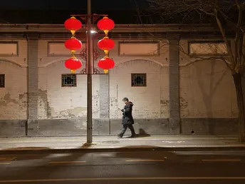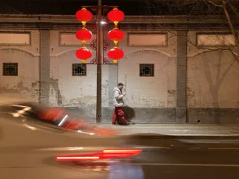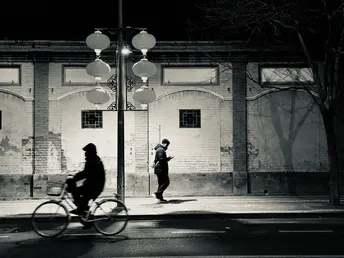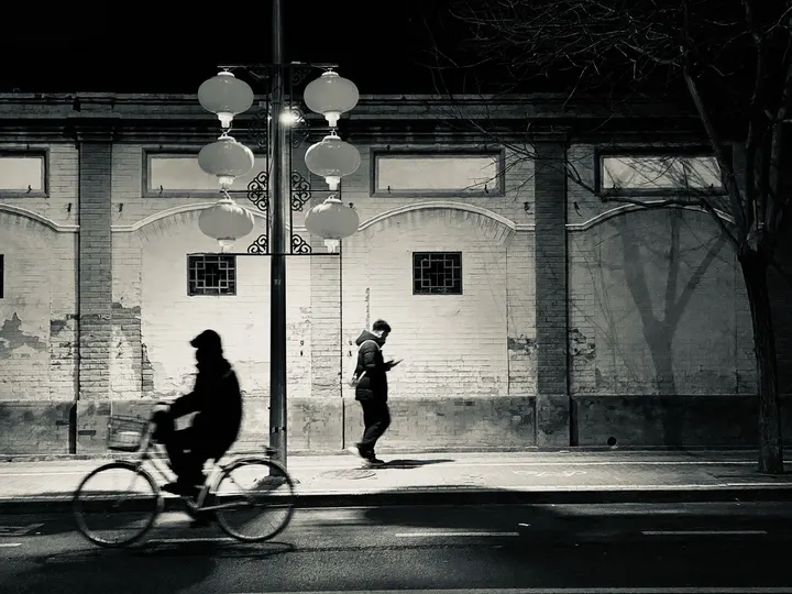 路灯杆上的红灯笼显示节日即将到来。晚上,天气寒冷,路上行人不多。等了一会儿,拍了几张路灯下匆匆走过的人。第一张调成黑白,另外两张保留了彩色。iPhone 11 Pro 拍摄,Snapseed 后期修图。