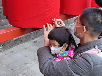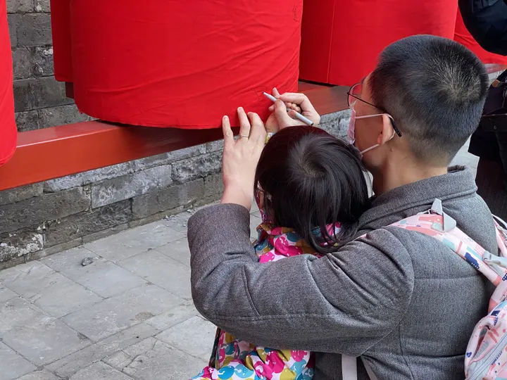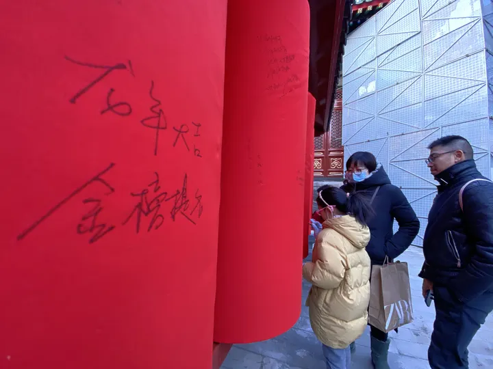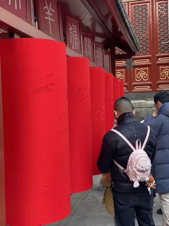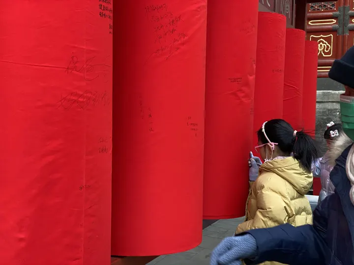 东岳庙里专门设置了几个圆柱形的柱子,外面包着红布,供人们写下新春祈愿。iPhone 11 Pro 拍摄。没有后期,因为没有想法。